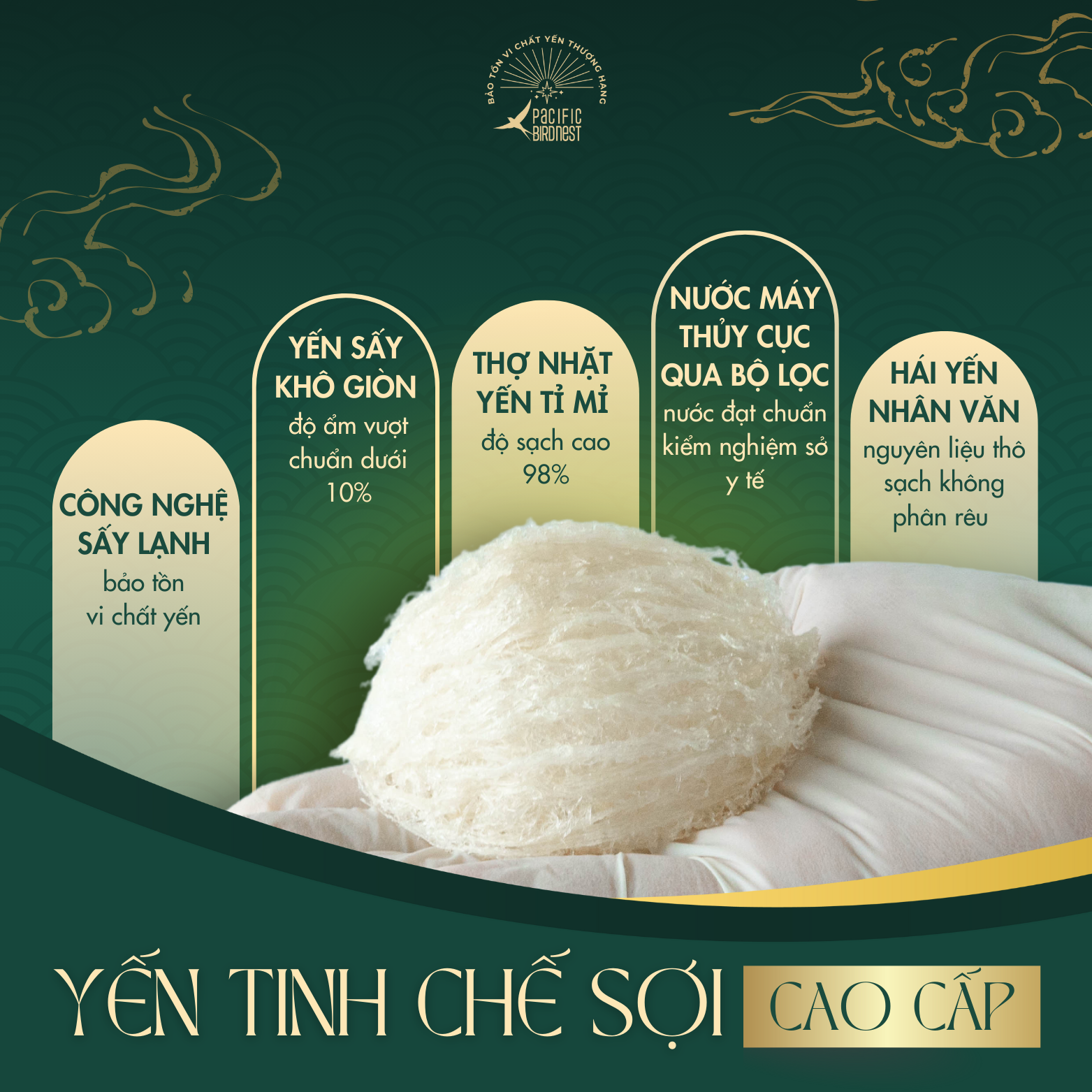 Lựa chọn nguyên liệu thô đầu vào sạch, không phân rêu trực tiếp từ nhà yến lâu năm. Yến được sơ chế làm sạch bằng phương pháp nhặt ướt, dưới dòng nước chảy liên tục, đảm bảo độ sạch lên đến 99% và bảo tồn vi chất yến tốt nhất. Yến sau khi được vào khuôn chuẩn với tỉ lệ 1:2 sẽ được sấy lạnh đến độ ẩm vượt chuẩn. Kiểm nghiệm chỉ tiêu chất dinh dưỡng trong yến tinh chế Pacific Bird Nest vượt chuẩn Nghị định của Chính phủ.